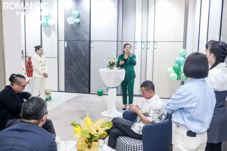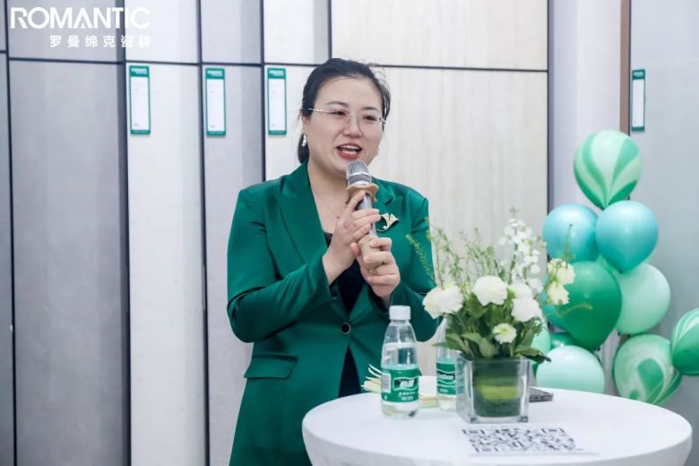 会上东莞厚街门店负责人杨钧钧女士为鉴赏会致辞,杨钧钧女士首先感谢各位到场业主及东莞设计界的朋友莅临本次罗曼缔克东莞厚街新品品鉴会。大方分享自己加入罗曼缔克瓷砖五年的真实经历,直言自己刚开始是被品牌名字所吸引,但始于名字终于品质。