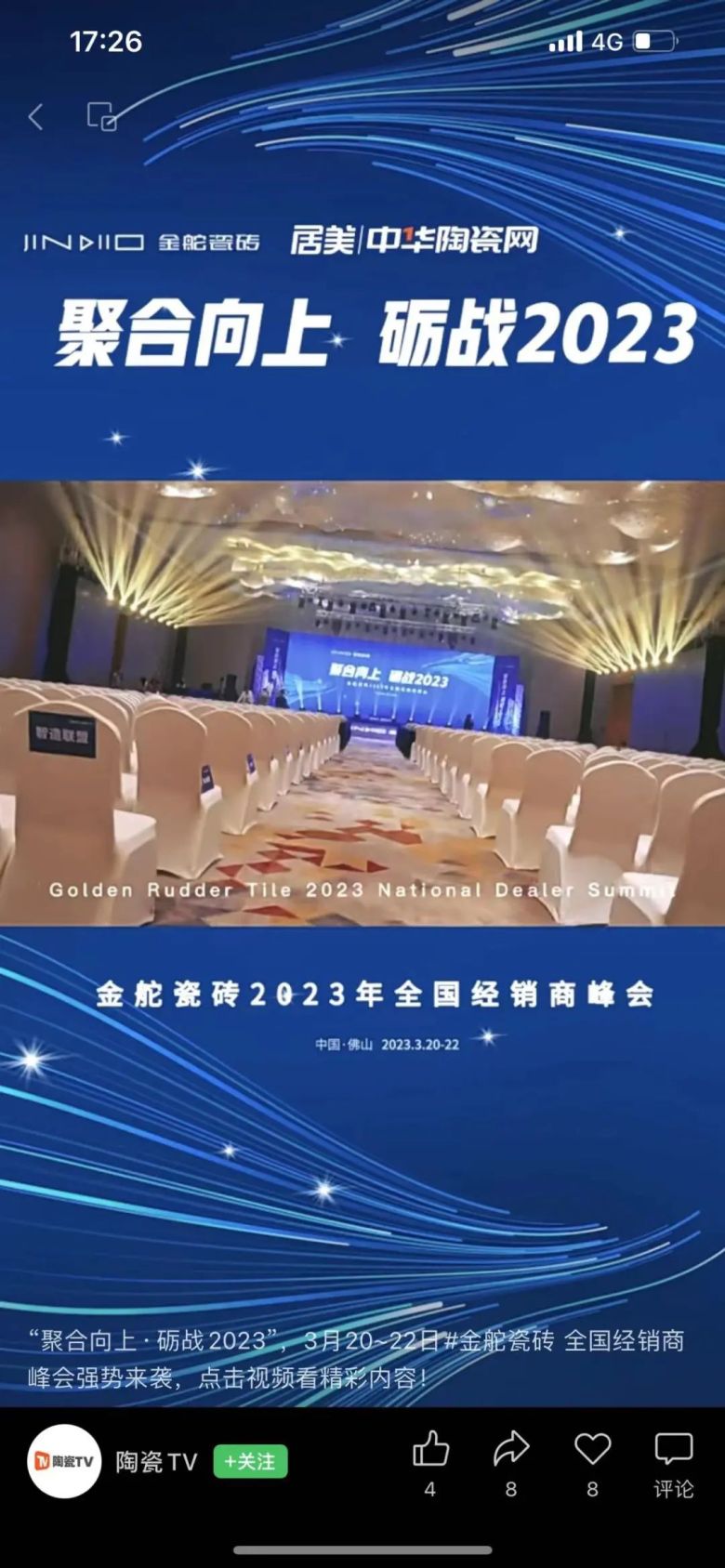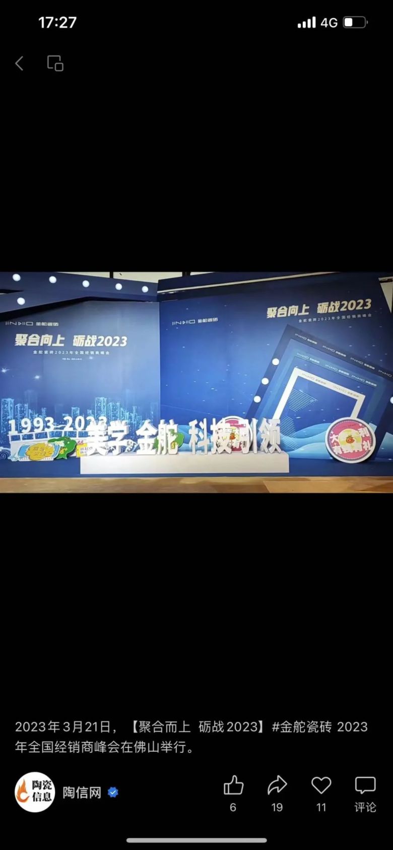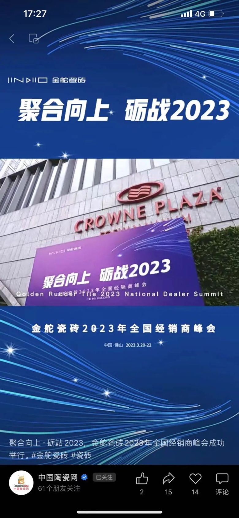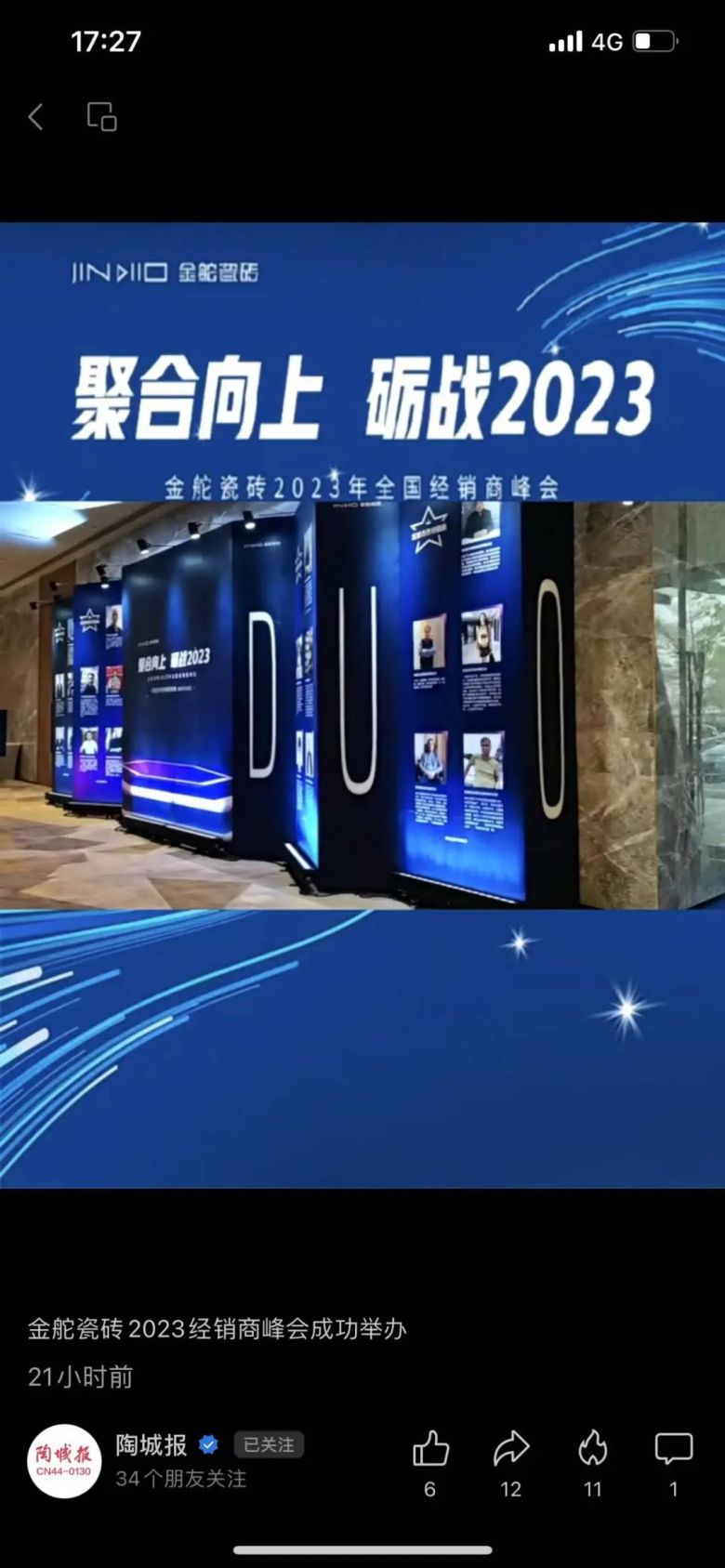 通过此次“聚合向上 砺战2023”的成功举办,全国金舵经销商家人们坚定了发展信心,清晰了发展方向,为赢战2023奠定了坚实基础,我们厂商将共同书写金舵瓷砖发展新篇章!