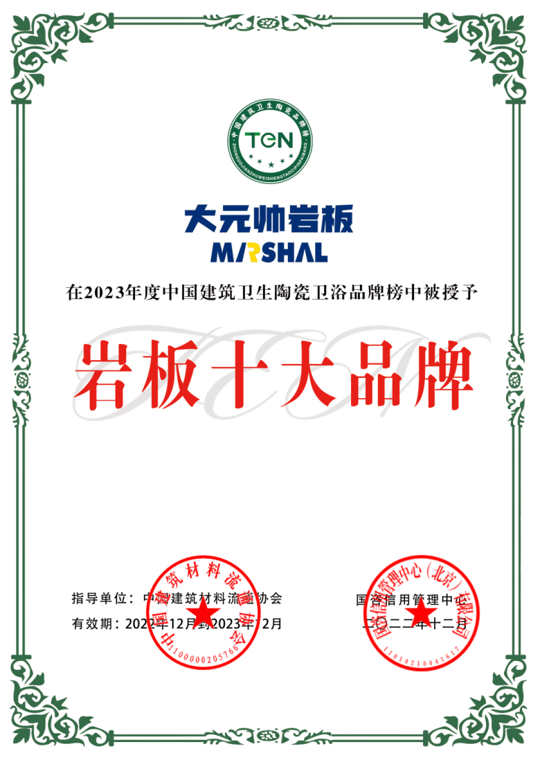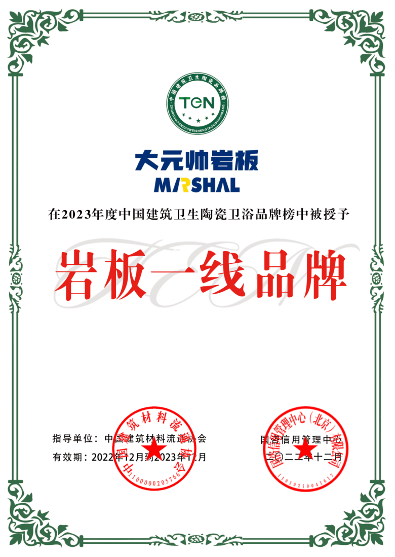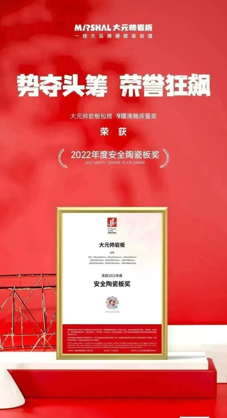即使建材市场迷雾重重,但大元帅的表现仍旧卓越不凡。单以2023年为着眼点,凭借稳定优越的产品性能以及过硬的产品质量,大元帅就荣获了多方的加冕,赢得社会与业界的广泛认同。「沸腾质量奖」、「岩板一线品牌」、「岩板十大品牌」等多项权威奖项实至名归。