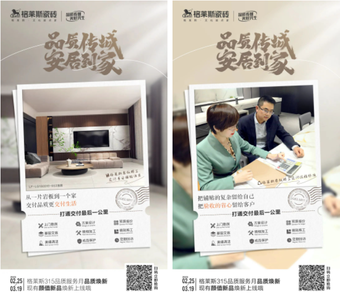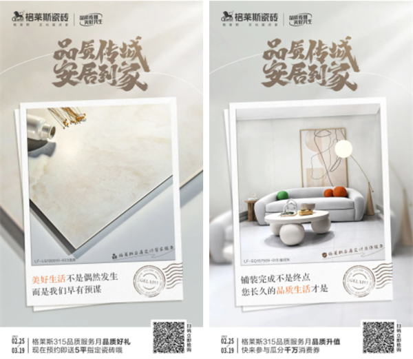 格莱斯瓷砖精准洞察了市场需求,此次315活动顺势而为,提出“品质传城,安居到家”活动主题,以企业产品质量和服务质量为核心,为用户提供从品质产品-品质服务-品质家居的一站式品质安心居住购物体验场景,这有助于产品在眼花缭乱的瓷砖市场中脱颖而出,也为品牌建设了核心竞争力。