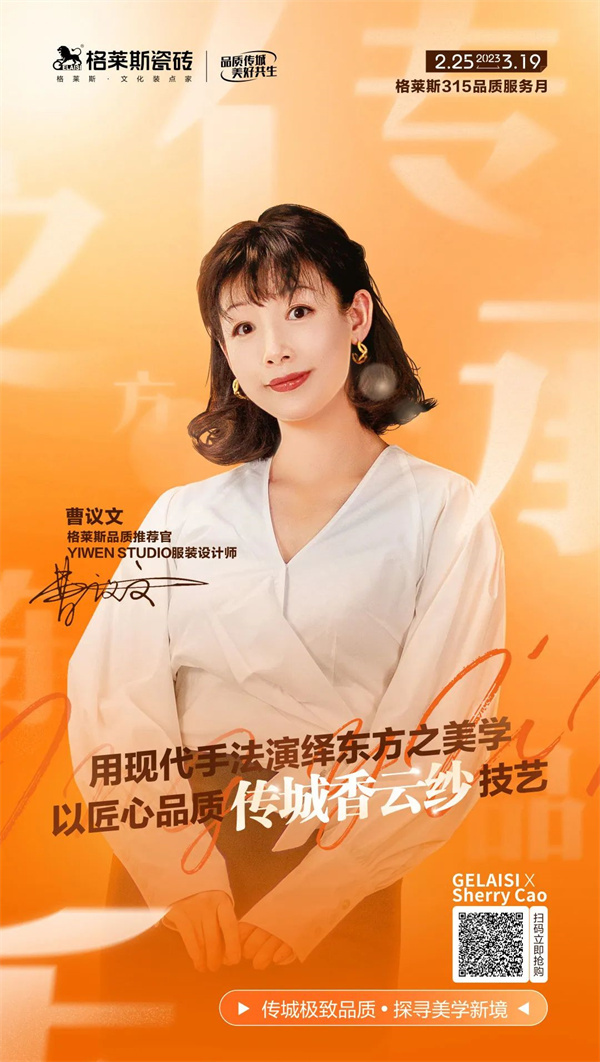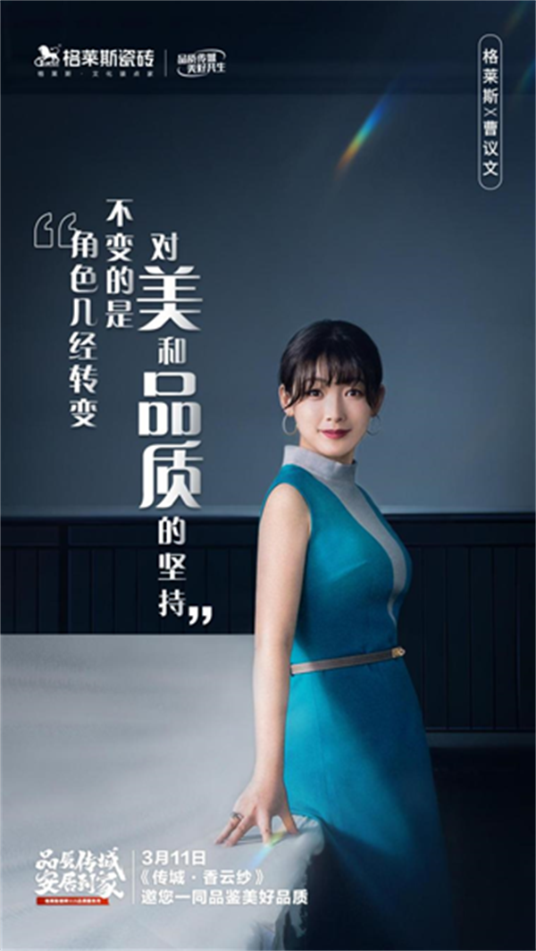 格莱斯瓷砖携手服装设计师曹议文的”品质传城 安居到家“315营销活动,以坚守美与品质为抓手,挖掘格莱斯作为品质瓷砖品牌的内生力,借由曹议文老师,演员时期对于演技的打磨,演绎路上永不停歇的探索、服装设计师时期对于面料的选材,服装最大化体现女性之美的追求,深化品牌的品质基因。