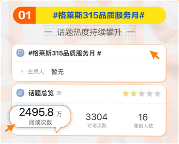 截至目前,#格莱斯315品质服务月#已超过2400W阅读量,成为开年315营销活动中撬动网友神经的重量级话题,在这一声量传播的过程之下,话题也以UGC原创内容互动与创作,有效沉淀优质内容。