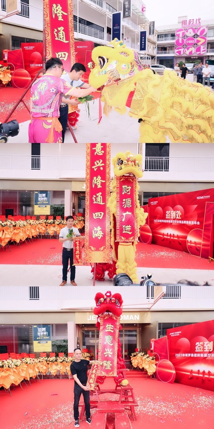 锣鼓阵阵送吉祥,瑞狮起舞好运至。瑞狮在铿锵的锣鼓声中起舞,为现场增添一份喜气和威武。领导嘉宾为祥狮点睛,寓意珍妮罗曼瓷砖生意蒸蒸日上!