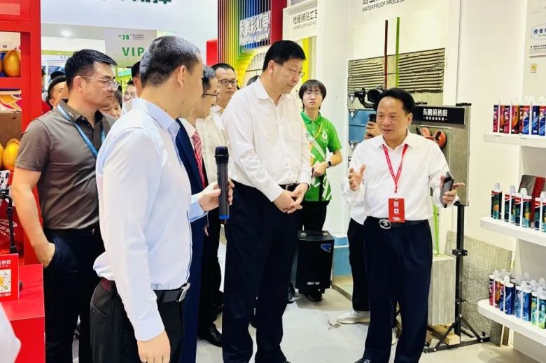 △ 佛山市市委副书记、市长白涛在东鹏控股董事长何新明的陪同下莅临东鹏辅材展位进行考察工作