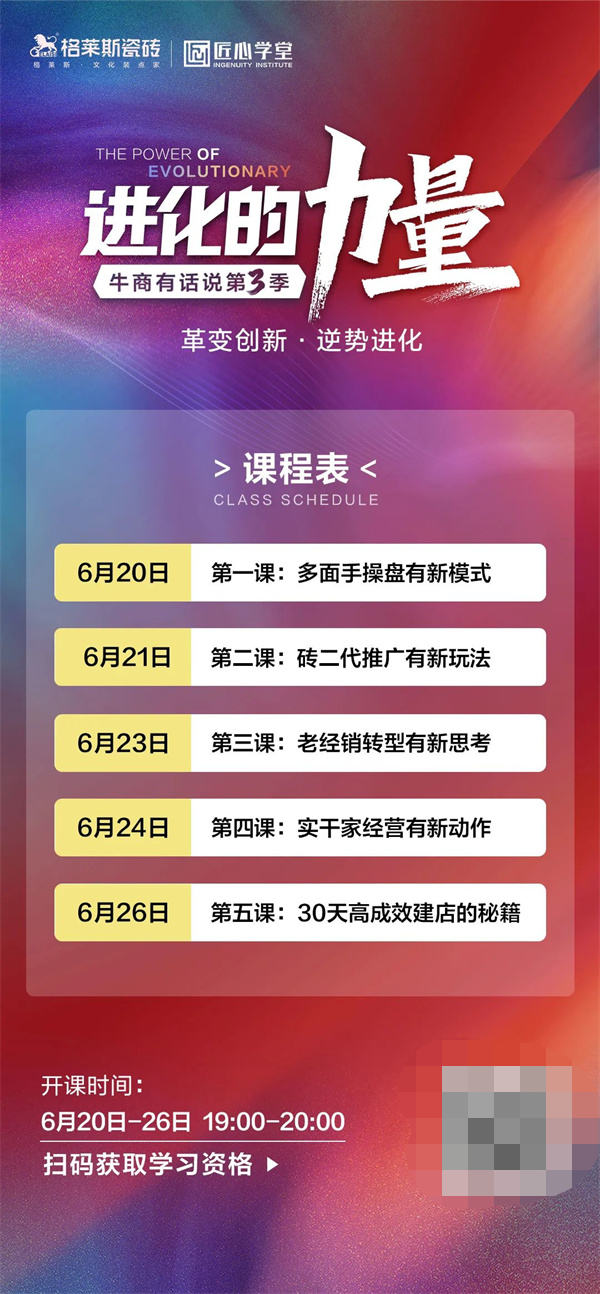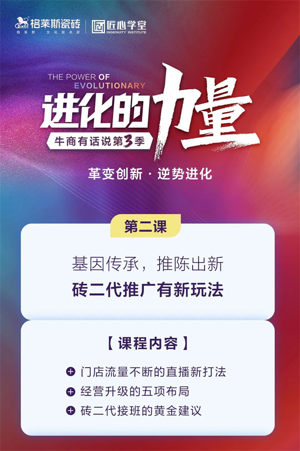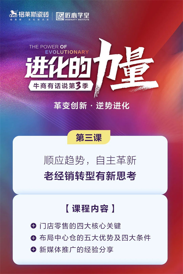 历经百多天的打磨,进化的力量——格莱斯瓷砖牛商有话说第三季课程正式启动!第三季内容立足国内外新形势,聚焦新机遇、新突破,寻找打破传统,不断求变,不断自我进化的牛商案例,旨在帮助经销商找新的业绩突破口,赋能终端。