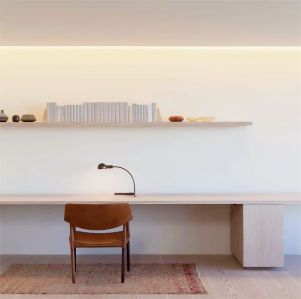 靠墙设置长桌,不仅可以拥有宽大的空间,还能多人使用,家人孩子一起读书都不会显拥挤。同时有了墙面的加持,还可以增加一些隔板做收纳,这样书籍近在手边,坐下来就可以随时阅读,拿取动线更方便。