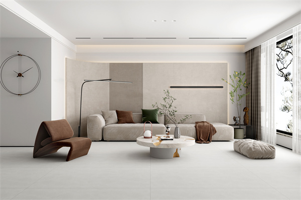背景墙选用木饰面岩板+原木的搭配,地面选用1800×900mm规格的柔光地砖螺之印·远山,整体以灰色调为基底,以简约现代设计理念,简化色彩搭配,品味其中的质感与深度,体验生活的“层次感”。