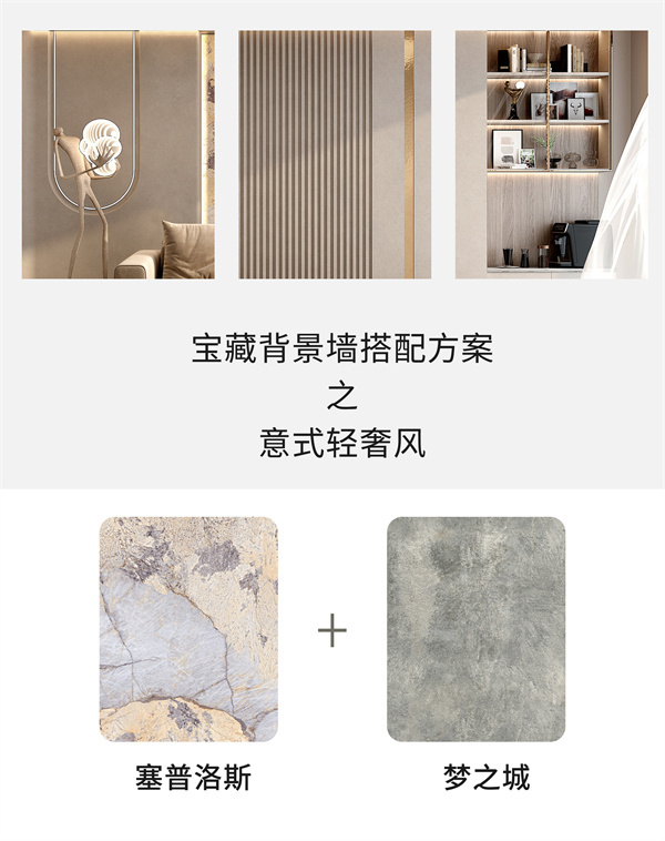 想要缓和大白墙的冷淡感,可以加入幻彩版面【塞普洛斯】,将传说的神秘感与奢华营造出来,也大大中和了素色背景墙带来的单调感。