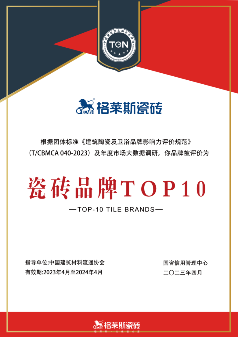 4月26日, “2023第九届全国陶瓷/卫浴经销商大会暨第十二届中国陶瓷卫浴品牌与酒店业合作峰会”上,格莱斯瓷砖一举斩获“瓷砖品牌TOP10”荣誉!