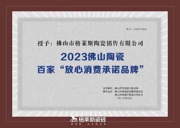 3月15日,格莱斯坚持用严谨的生产流程为消费者提供国货优质的瓷砖产品,为消费者带来舒畅安心的购物体验,荣获2023年佛山陶瓷百家“放心消费承诺品牌”称号。