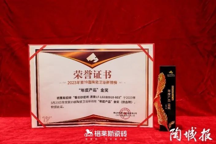 5月23日,格莱斯“香云纱瓷砖-清漪”在众多产品中脱颖而出,荣获新锐榜“年度产品金奖”重磅奖项。