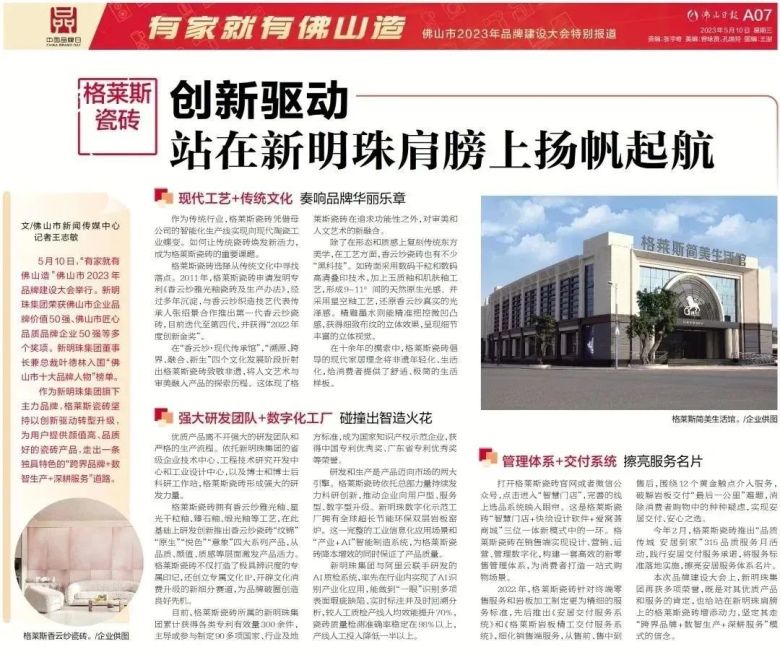 5月10日中国品牌日,格莱斯瓷砖坚持以创新驱动转型升级得到肯定和认可,以品牌建设大会特别报道刊登于《佛山日报》,文章同步转发到多个权威媒体平台。