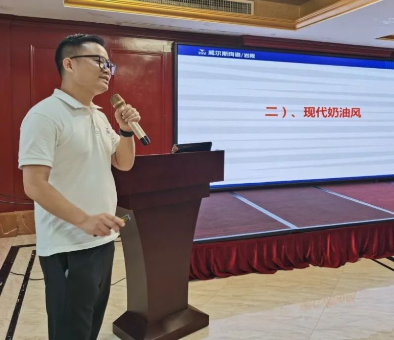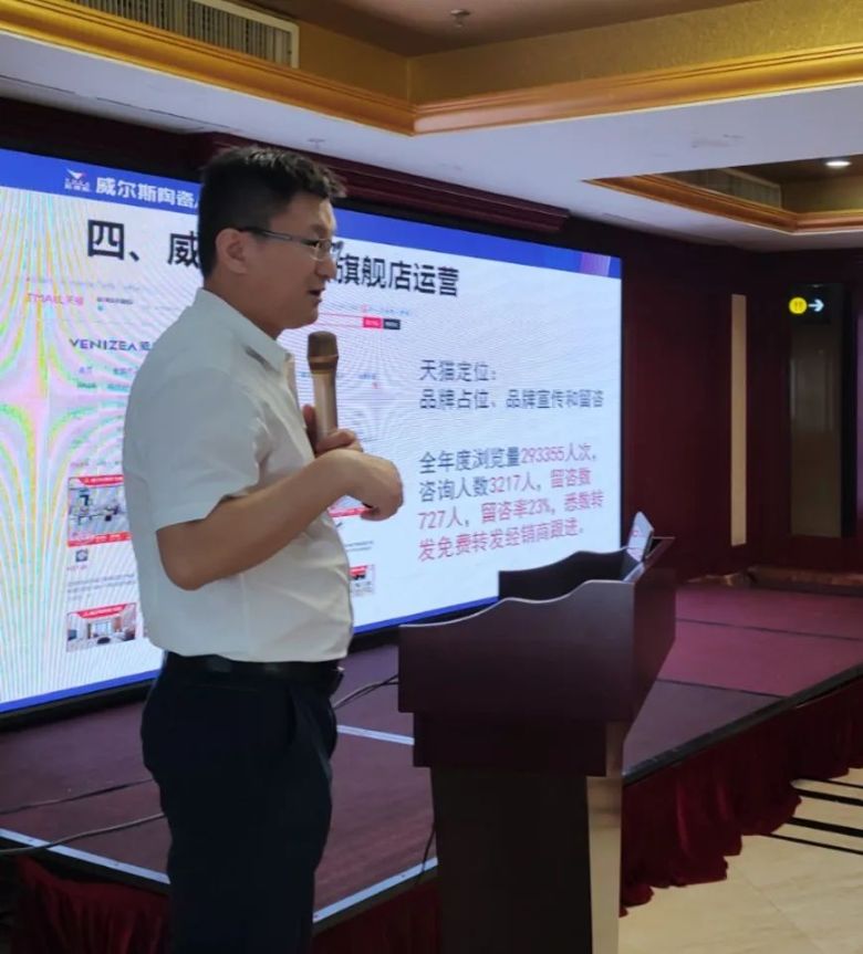 在接下来的会议中,总部派出阵容强大的讲师队伍,对与会人员进行培训赋能。销售总监夏文洪、晋江威尔斯蔡总对会议进行致辞。在赋能会议上,总部培训队伍从威尔斯品牌形象、产品优势到新型引流方式等进行了全面分享。其中,市场部总监韩邦升对总部在线上的各项服务、未来的推广方向作了详细的分享;设计部总监陈胜传对终端常见的家居设计风格、威尔斯全新店面设计、日常维护等作了细致的讲解。让参会的经销商对威尔斯品牌、产品及服务等的认识更上一层楼,对未来的发展模式有了全新认识,收获满满!
