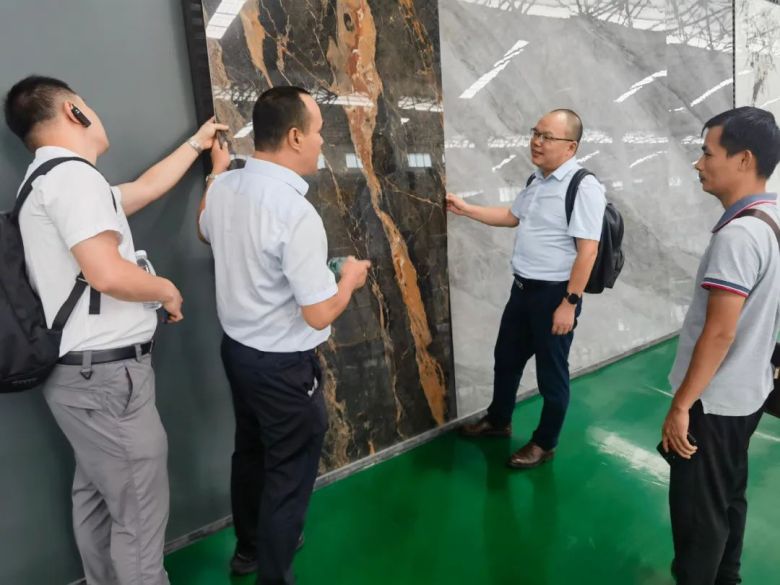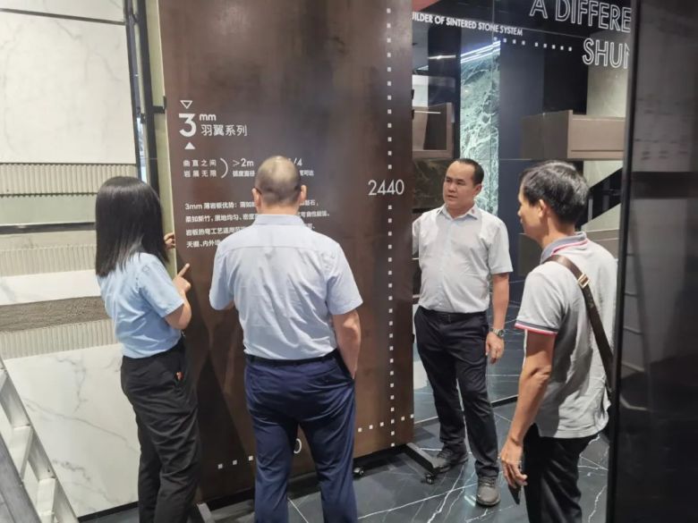 陈总监带领海南发展控股领导一行人先后参观了岩板和瓷砖展示区域,为大家详细介绍顺辉瓷砖·岩板产品的工艺特色,并近距离感受顺辉在产品研发、品质把控和应用创新上的匠心魅力。考察团一行对顺辉瓷砖·岩板有了更深入了解,也对顺辉25年始终匠心如一的智能制造表示充分肯定和赞赏。
