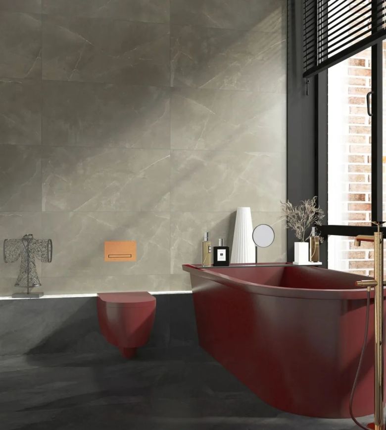 TWM48013S卡塔尼亚灰,每一丝纹理如流水飞瀑般,恣意倾斜砖面,斑驳间的融入打破了其中的沉闷。摩登质感萦绕下邂逅复古的棕红浴缸,其流线式的线条,细节处精巧的弧度,将主人的个性追求展现无遗!