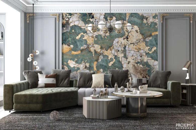 高贵优雅的绿色,温暖有层次的暖色调,交织着细腻的黄色脉络,色彩对比鲜明,为空间注入自然、历史和艺术氛围。