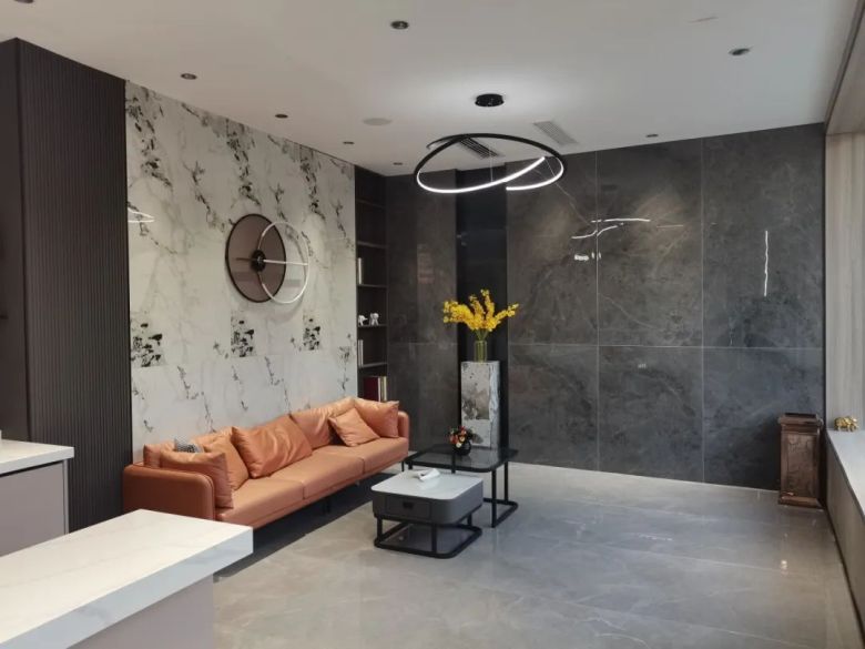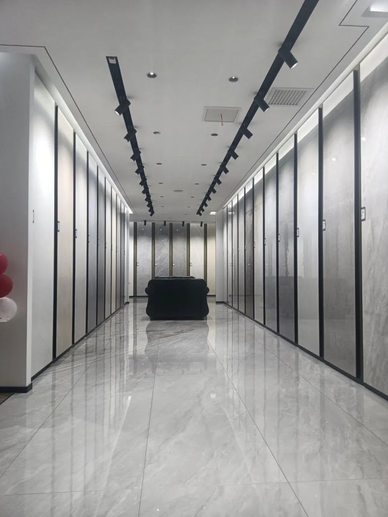 选材区品类齐全、花色新颖,空间视野开阔、线条设计兼具艺术感,在筒灯的照射下,鹰牌每一片瓷砖产品的肌理、光感、质感一一呈现,不仅为用户选购产品提供无穷的想象力,也为选材区得空间增添几分灵动之感。