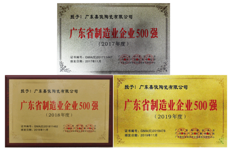 这是嘉俊第四次被评为“广东省制造业500强企业”。在此之前的2017至2019年内,嘉俊陶瓷已连续三年获得该项荣誉。由此可见,嘉俊陶瓷的企业实力得到了社会与行业的高度认可。