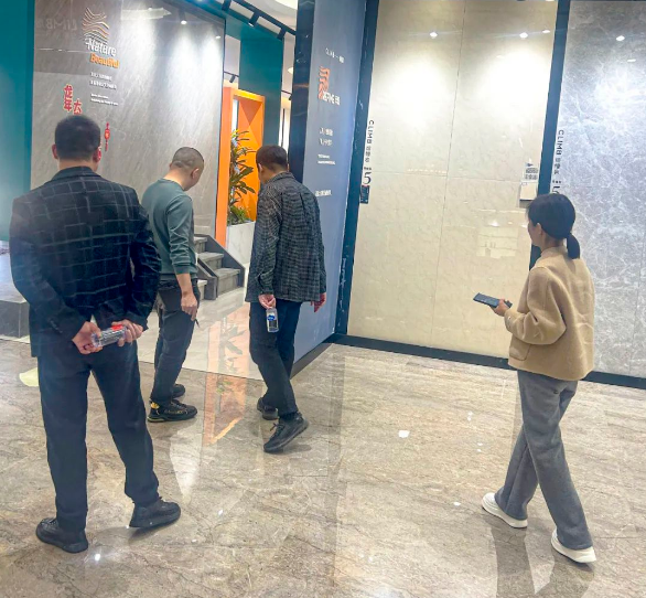 百闻不如一见,主题分享结束后,与会经销商来到展厅参观熔幔岩5.0克隆石新品,在高度认可新品的同时,从质感、色泽、纹理、规格等方面进行积极讨论,多维度分析、评估新品上市后消费者的喜爱度,满怀信心能够通过新的产品和方法抢占市场先机。