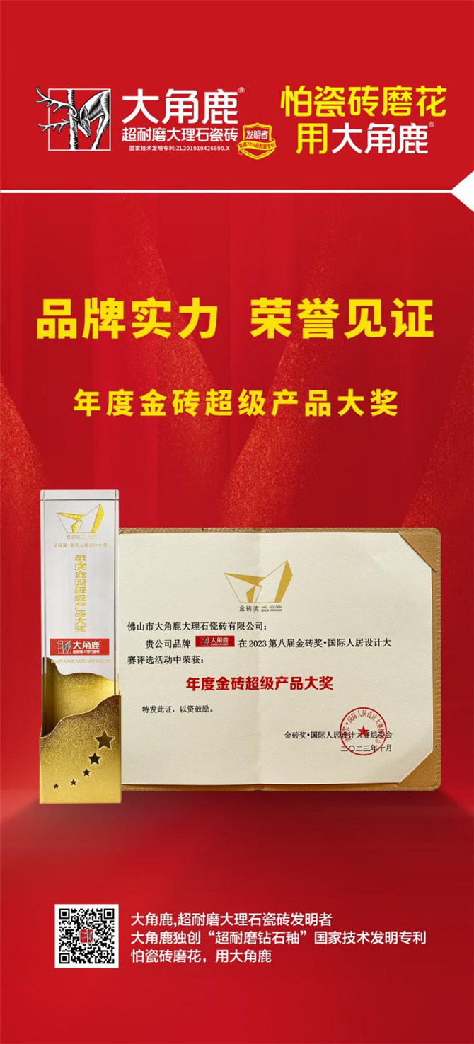 10月11日,2023第八届金砖奖•国际人居设计大赛颁奖盛典在佛山举行。中国瓷砖增长王大角鹿凭借引领全球的超耐磨技术和强大的品牌实力,斩获“年度金砖超级产品大奖”。这份荣誉,既是行业对大角鹿的高度认可,也是大角鹿的实至名归!
