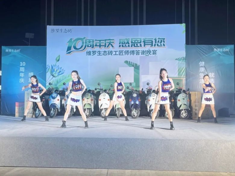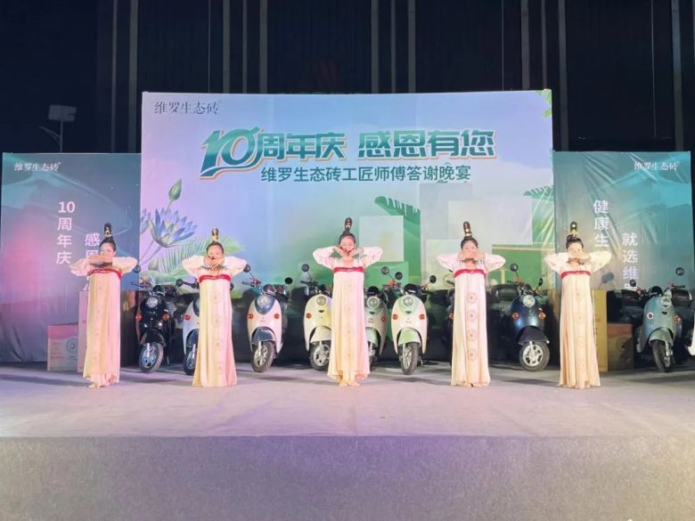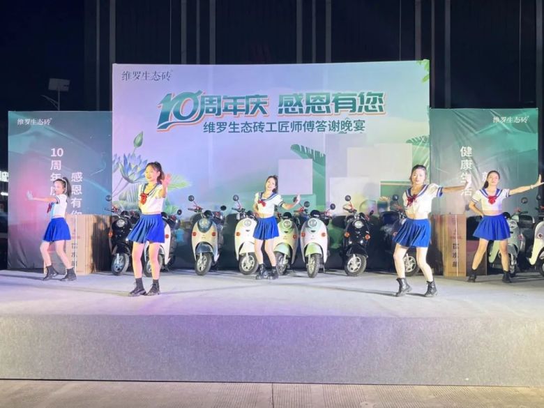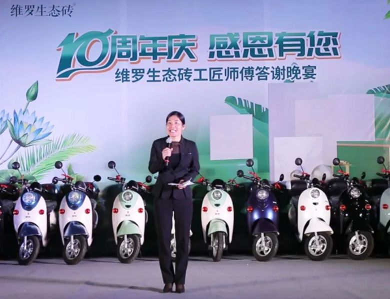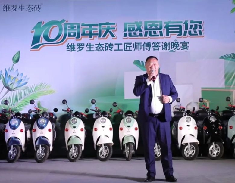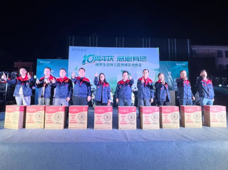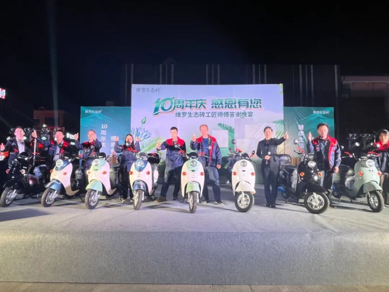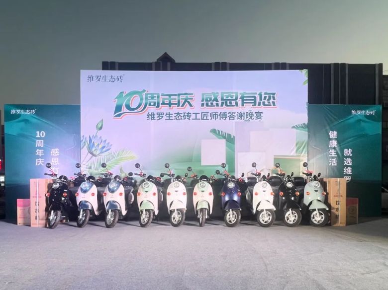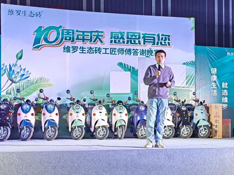 活动上,维罗生态砖市场部推广主管潘照炳代表品牌向维罗来宾运营中心团队表示衷心的祝福,同时为在场来宾带来了来自广东来自厂家丰厚的礼物与平台共享政策,拿出100台新能源电动摩托车感恩回馈大家。他表示,维罗生态砖致力于打造中国第一生态品牌,21年来专注生态健康家居美学,健康、绿色、生态、环保是我们品牌的底色,超抗菌防滑产品是我们品牌的特色,而你们出色的铺贴手艺让千家万户安心无忧获得生态与美学共融的新生活,感恩10年有您。