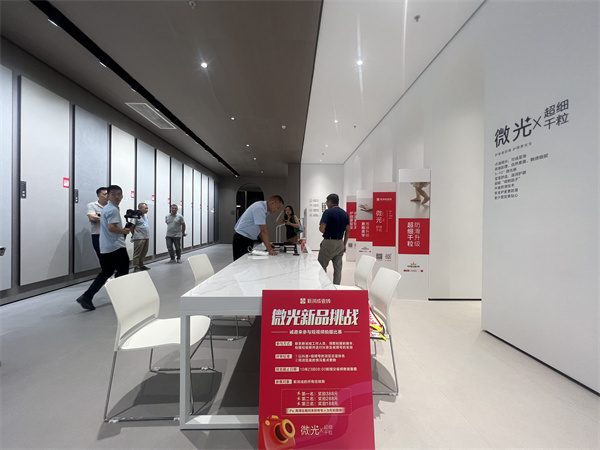 活动的最后一个环节,新润成瓷砖设计总监杨志勇与主持人从新润成瓷砖总部展厅大堂走到微光区域开启“追光之旅”,并进行了新产品的测评,让在线粉丝更进一步探寻新润成瓷砖微光超细干粒新品的魅力。