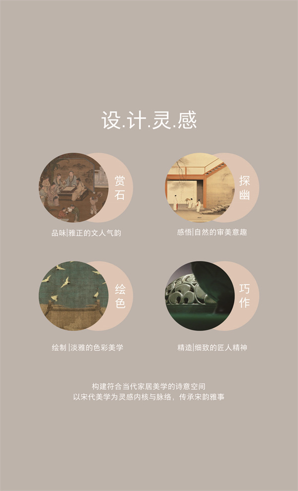 在美学灵感方面,我们从宋人四大生活雅事——赏石、探幽、绘色、巧作中,提炼出宋代美学的内核,构建一个符合当代美学的意境空间,领略宋代审美的自然之美、色彩之美、匠心之美,文化之美。