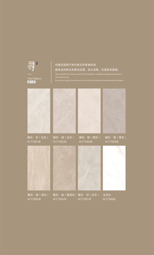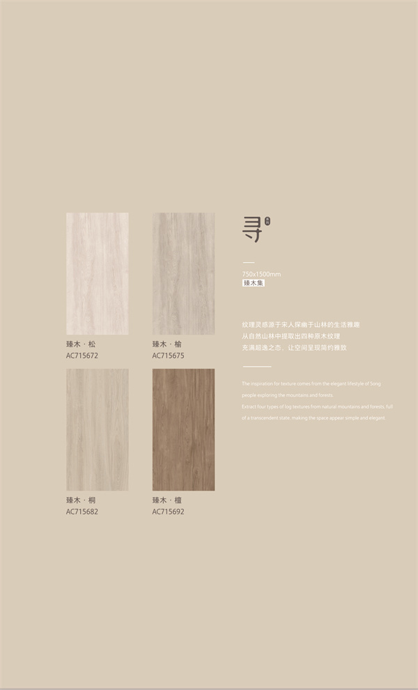 “寻”系列,包涵雅石集、臻木集,原石纹、原木纹两种不同纹理设计素材,给消费者更多样化的纹理选择。