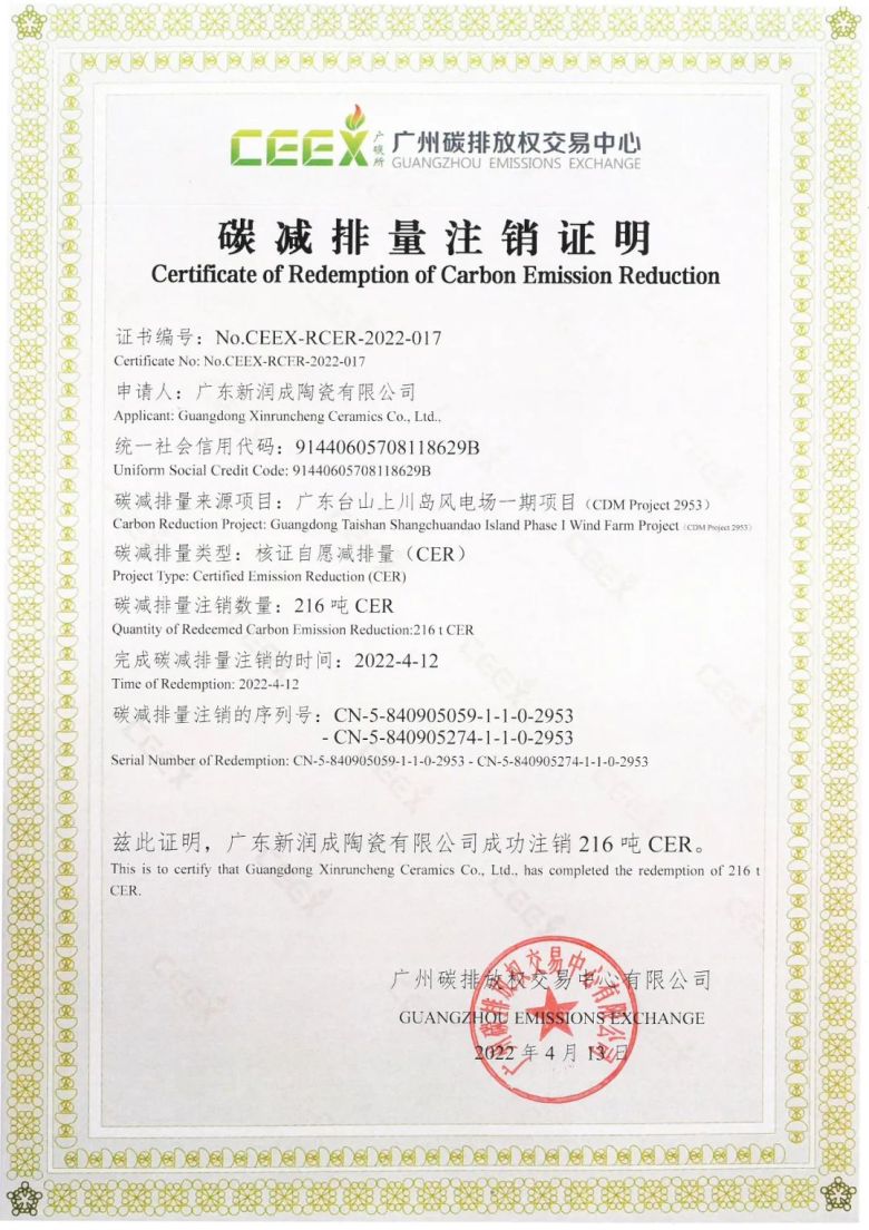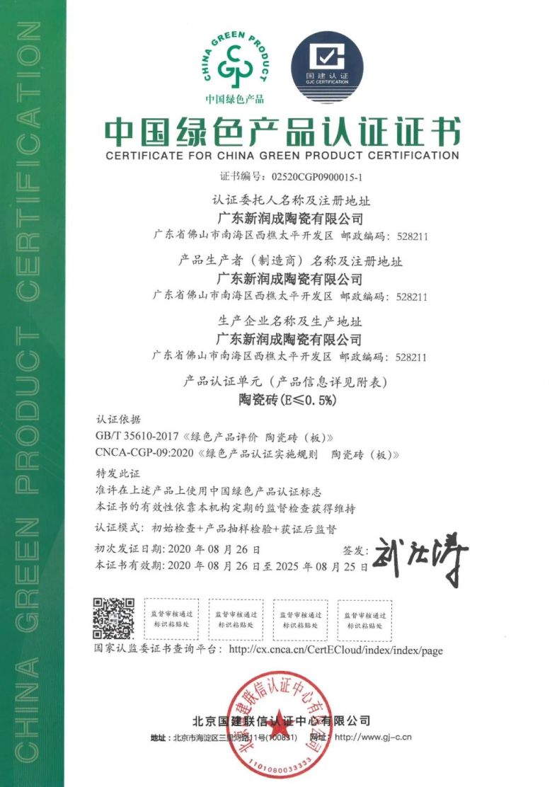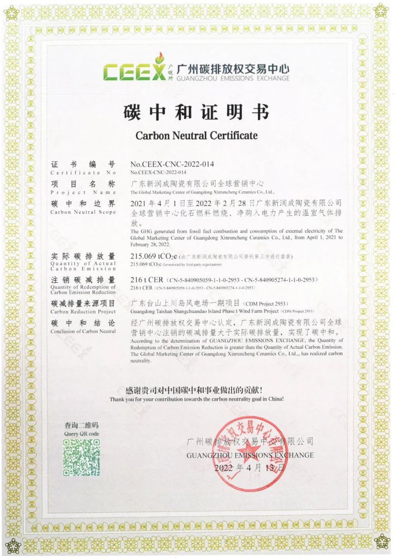 从绿色制造走向绿色消费,25年来,广东新润成陶瓷有限公司坚持生态经营,绿色发展。我司全面使用天然气,与科达携手拉开了新润成5G数字化制造项目。近年来,更是获得了“中国绿色产品认证证书”“绿色建材评价标识证书”“碳中和证明书”“绿色工厂”等绿色称号,助力广大消费者健康筑家,为国家低碳发展贡献力量!