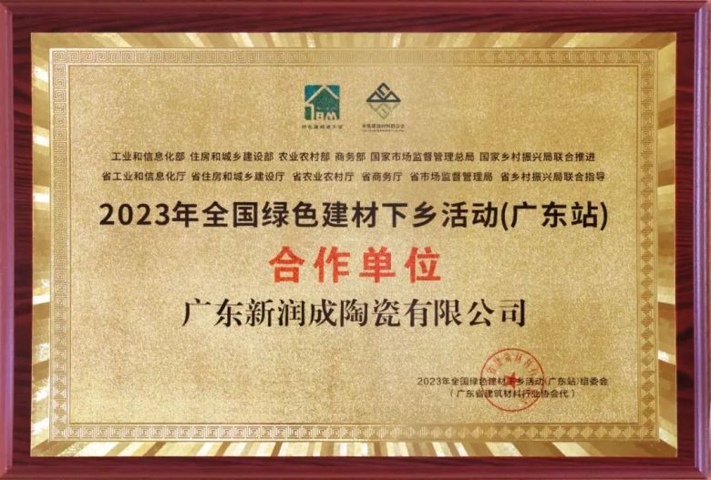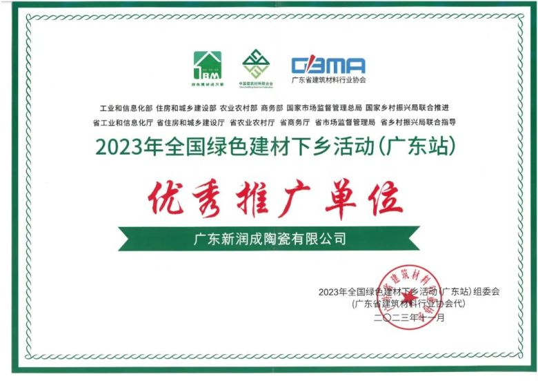 11月23日,2023年全国绿色建材下乡活动(广东站)总结会暨第二届数智建筑与新型建筑工业化发展大会在华夏陶瓷博览城顺利举办!会上,广东新润成陶瓷有限公司获颁2023年全国绿色建材下乡活动(广东站)“优秀推广单位”称号,对广东新润成陶瓷有限公司在绿色建材生产、推广方面的表现给予了高度肯定。