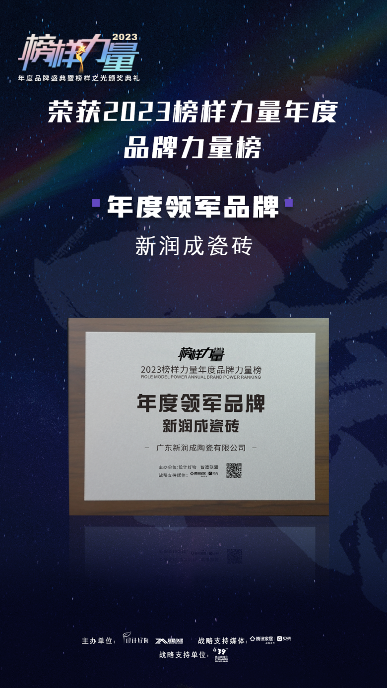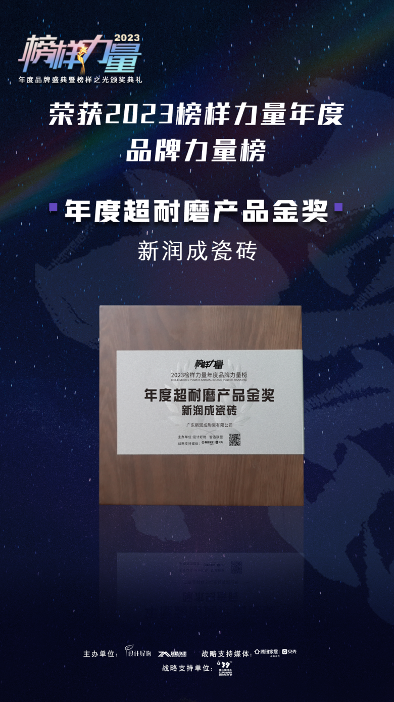2023年8月12日,由智造联盟、设计好物主办,腾讯家居|贝壳战略媒体支持,2023榜样力量年度品牌盛典暨榜样之光颁奖典礼在佛山樵山文化中心C馆举行,此次盛典中,新润成瓷砖凭借自身严选的产品和服务在众多的品牌中脱颖而出,揽获“年度领军品牌”和“年度超耐磨产品金奖”大奖!