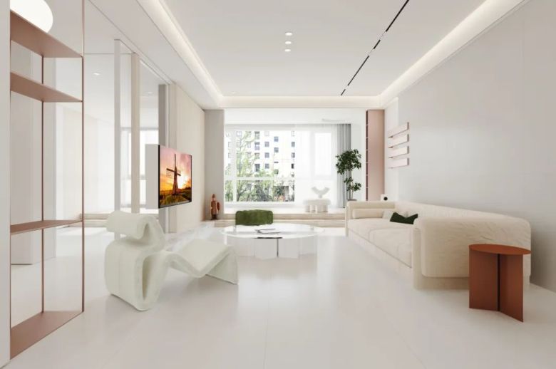 自带滤镜的奶白色,家的气质就是如此从容不凡。奶白色墙板设计,色彩饱和度整体偏低,搭配奶乎乎柔软细腻的沙发和矮圆木质茶几,几何形状错落有致。这样的布局既有侘寂的清雅,又具备奶油的圆润,整个空间都弥漫着质朴而温暖的气息。