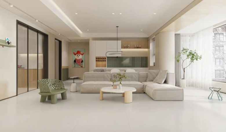 不张扬的浅灰色沙发将柔和内敛的本质全然诉说,通铺的奶灰色瓷砖,让客厅更显整洁而雅致,高级且耐看,给人一种安宁舒适的家居氛围感。