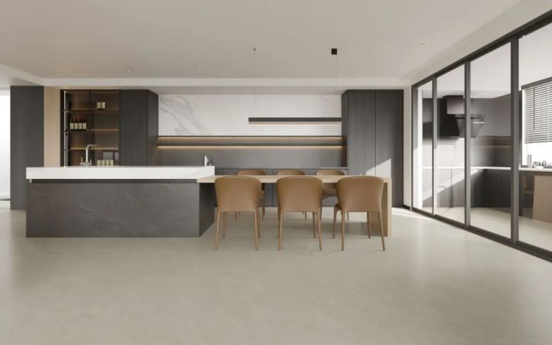 云岫偏暖色系,砖面上淡淡的纹理若隐若现,搭配相近色系的软装让空间散发着清爽的气息;空间设计了开放式餐厨区域,产品通铺增大空间在视觉上的大小,是真素简却不凡的代表作。