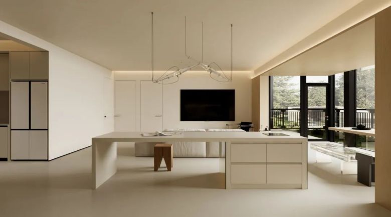 石淙是带点“美拉德”风的产品,砖面会有些许的纹理,突显了产品的创造力,纵览客餐区域,空间清透感一目了然;再添上一盏设计感十足的吊灯,营造出有韵味的素简风。