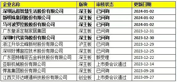 这些企业包括皇派家居、时代装饰、远超智慧(CBD家居)、新明珠、好博窗控、马可波罗瓷砖等,目前它们都更新了财务资料并恢复IPO审核进程。