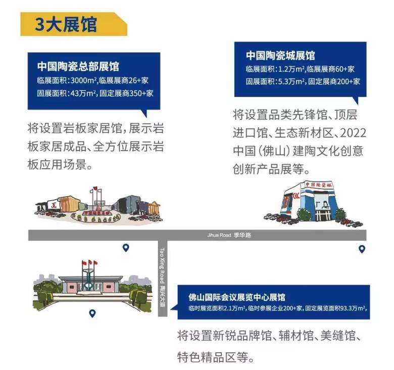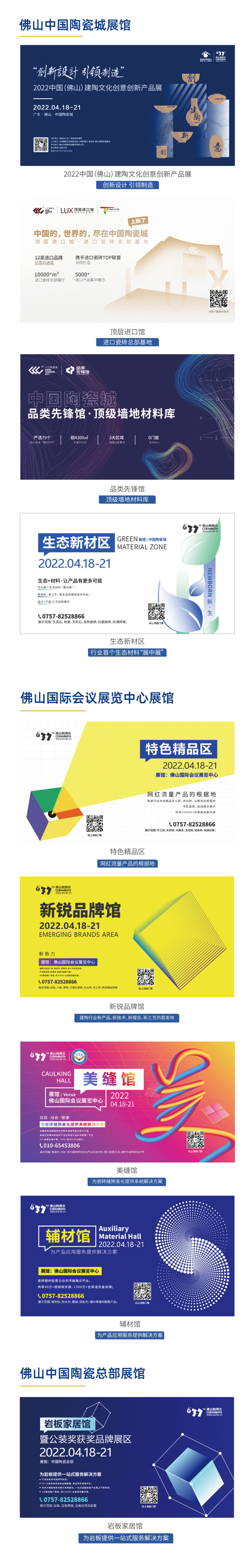 第37届佛山陶博会特设2022中国(佛山)建陶文化创意创新产品展、顶层进口馆、品类先锋馆、进口品牌区、生态新材区、岩板家居馆、新锐品牌馆、美缝馆、辅材馆、特色精品区等10个主题展区,汇聚岩板/大板、厚板、发热瓷砖、绿色新材、特色精品等3万+潮流新品,全面展示连纹、工艺面、数码釉、密缝等热门工艺与花色。