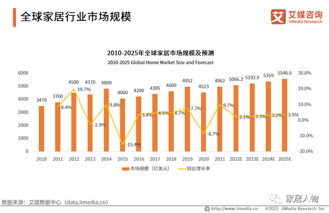 艾媒咨询数据显示,2010-2025年全球家居市场规模呈现波动上升的趋势。2021年,全球家居市场规模为4962亿美元,预计在未来四年中,全球家居的市场规模继续增长,但其增长幅度却维持在3%左右。艾媒咨询分析师认为,虽然全球家居行业受到疫情影响,但其市场规模的上升空间大,同时各品牌间的竞争也会加剧。