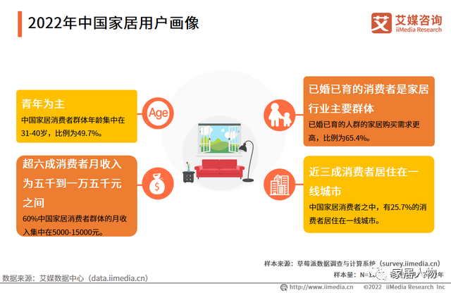 艾媒咨询数据显示,中国家居消费群体主要以青年为主,年龄段以31-40岁较多(49.7%)。超六成消费者月收入为5000-15000元,多数是已婚已育的消费者,其中有三成消费者居住在一线城市。艾媒咨询分析师认为,虽然目前的消费群体主要还是已婚已育消费者为主,但随着现在单身人口逐渐增多,晚婚理念逐渐渗透,将来家居的需求人群将会逐渐从已婚已育过渡到以单身群体为主。