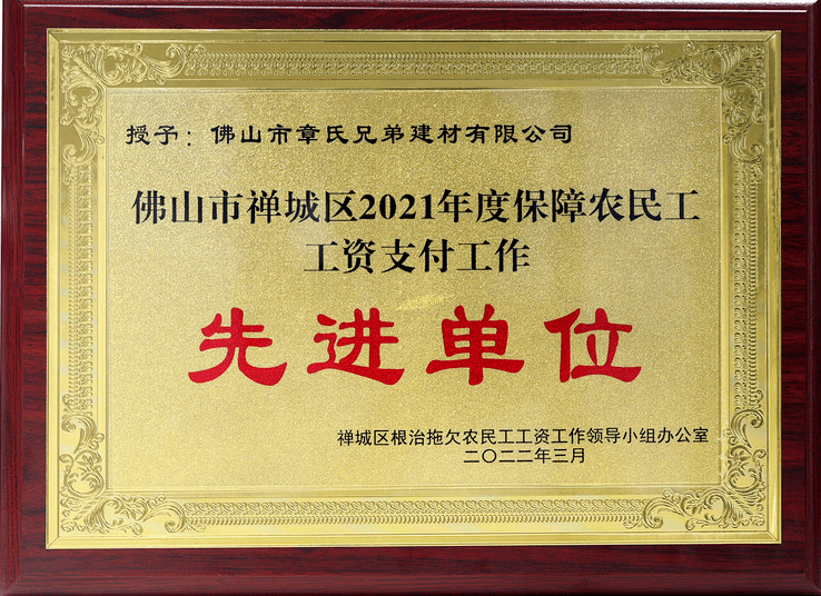 会上,南庄镇综合行政执法办公室代禅城区工作领导小组办公室,对在2021年度未发生过欠薪情况,同时亦为保障农民工工资支付工作作出有力贡献的相关先进单位进行表扬。佛山市章氏兄弟建材有限公司一直高度重视职工工资支付问题,依法保障职工合法权益,荣获佛山市禅城区“先进单位”称号。