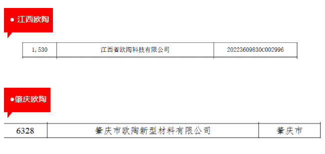江西省欧陶科技有限公司、 肇庆市欧陶新型材料有限公司均为国家高新技术企业,专精特新中小企业,组建了“江西省陶瓷化工新材料技术创新战略联盟”、“广东省新型陶瓷添加剂工程技术研究中心”和“肇庆市西江创新团队”,欧陶注重科技投入,以创新引领发展,在陶瓷化工新材料研发生产方面取得了一定成效,先后承担省级科研项目4个,参与起草行业标准1个,获得国家授权的各类专利196件。