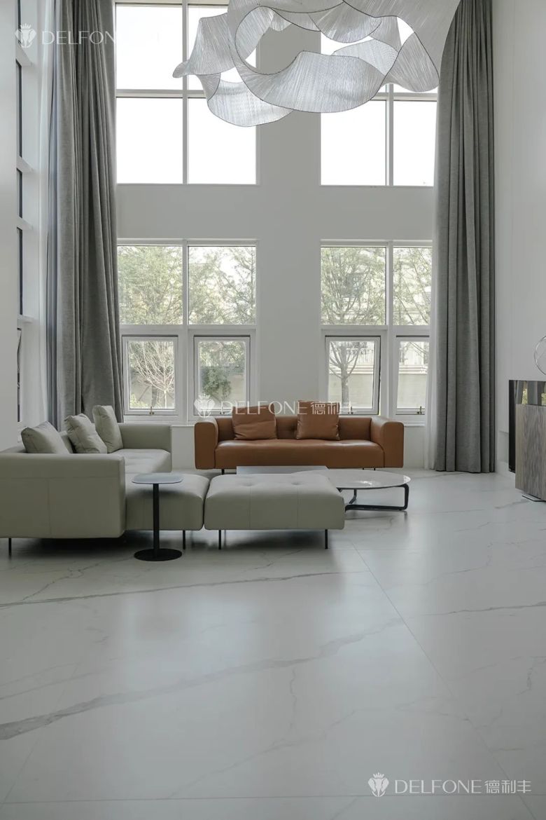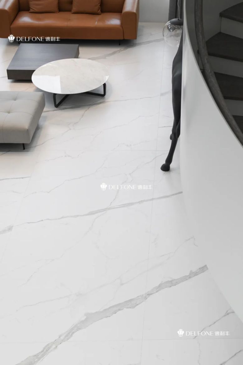 【阿尔卑斯香雪白】通铺全屋地面,如高山的皑皑白雪,加以连纹设计演绎雪山连绵之美,营造出一种超凡脱俗的存在感,与简约的环境完美契合,使整体空间呈现精致非凡的质感。