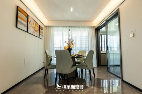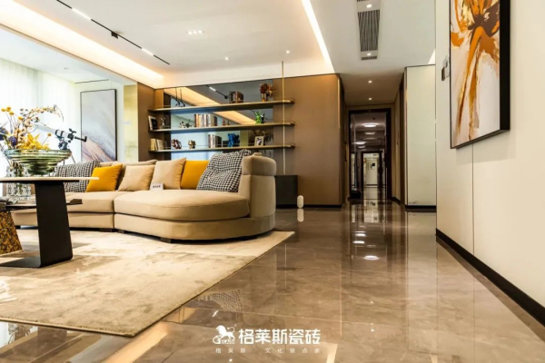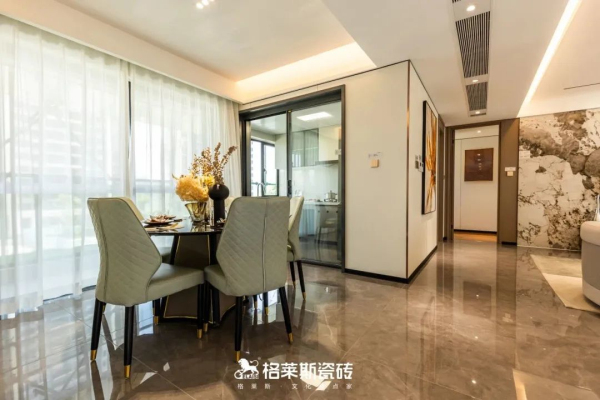 一进门首先就能感受到整体空间开阔舒适,客厅地面整体采用浅灰色作为主色调,选用750x1500mm的山河系列盐湖灰进行铺贴,砖面90度的光面让整个空间视觉通透明亮,自然采光通过镜面光感的瓷砖带入空间,呈现出极致且不失温润的丰盈质感。