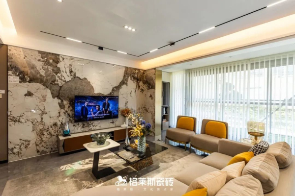 客厅沙发、地毯与瓷砖的浅灰调形成了高级的层次感,背景墙山河系列岩板张扬的肌理搭配热情的橙黄,碰撞出时尚的个性感,年轻活力中觅见生活品位的相得益彰。
