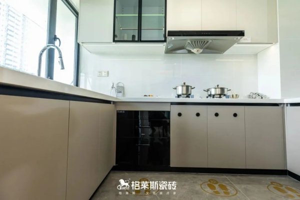 地面使用客餐厅延伸通铺,高级又显气质的灰调瓷砖不仅使得整体空间更显立体,更考虑到厨房地砖最为重要的耐脏功能,颜值与实用都要全面兼顾。