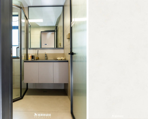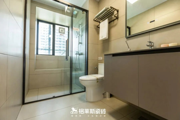 卫生间墙面铺贴格莱斯阳光浅米色,暖阳的色调温馨舒适,墙地同色系的深浅过渡,提升空间层次感,哑光砖面温柔雅致,呈现出几分淡淡的恬静,在室内营造出了软糯的视觉效果,置身其中,洗漱褪去的一身疲劳,感觉神清气爽!