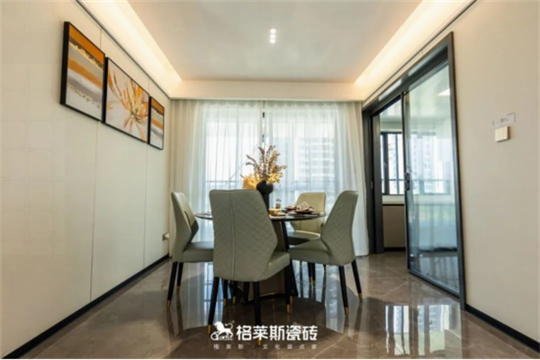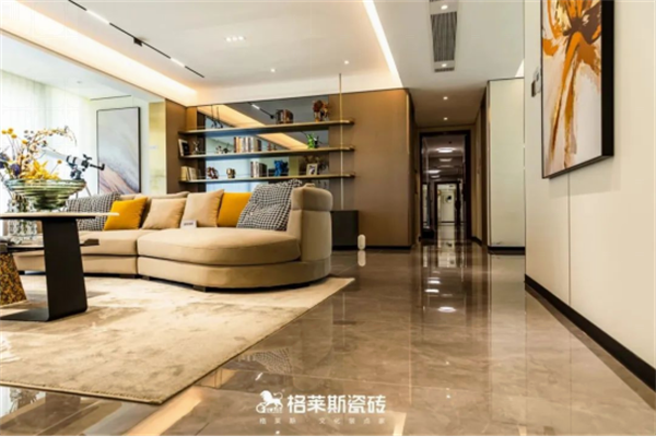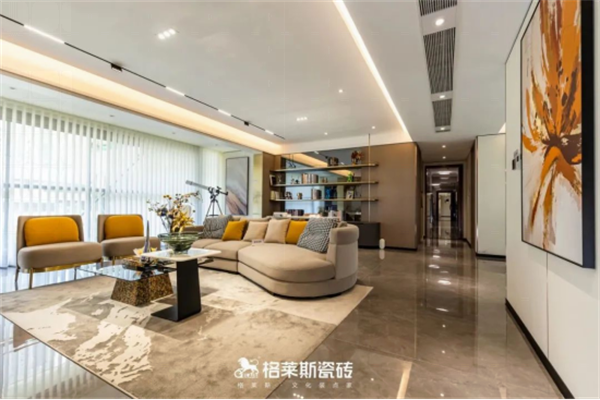 一进门首先就能感受到整体空间开阔舒适,客厅地面整体采用浅灰色作为主色调,选用750x1500mm的山河系列盐湖灰进行铺贴,砖面90度的光面让整个空间视觉通透明亮,自然采光通过镜面光感的瓷砖带入空间,呈现出极致且不失温润的丰盈质感。