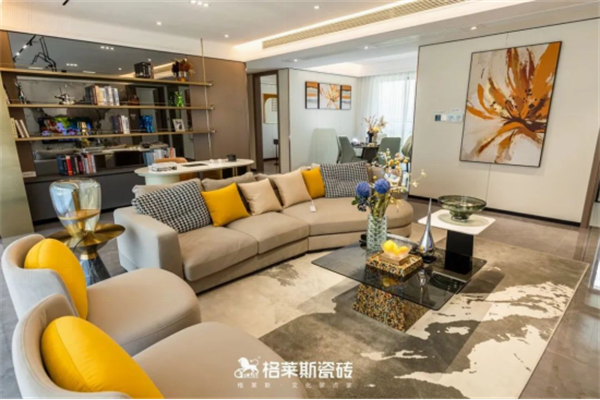 客厅沙发、地毯与瓷砖的浅灰调形成了高级的层次感,背景墙山河系列岩板张扬的肌理搭配热情的橙黄,碰撞出时尚的个性感,年轻活力中觅见生活品位的相得益彰。