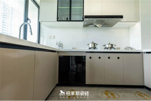地面使用客餐厅延伸通铺,高级又显气质的灰调瓷砖不仅使得整体空间更显立体,更考虑到厨房地砖最为重要的耐脏功能,颜值与实用都要全面兼顾。
