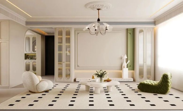 客厅随着石膏线条铺开,奶油色的墙面搭配微水泥地砖,优雅气场渗透进整个空间,奶呼呼软绵绵的泡泡沙发,填补了空旷感,增加了生活的温度,同时让空间更加通透宽敞。